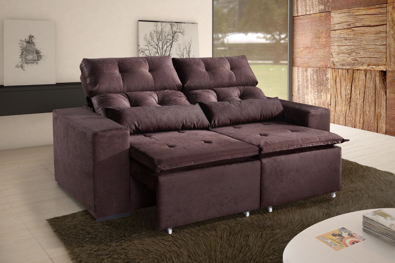 Sofá Retrátil/Reclinável Ubá, em Veludo Suede, Côr Azul 16, da Diviminas, Medidas: Alt 0,97m Larg 2,00m Porf Fechado 0,96m Prof Aberto 1,31m, Módulos Bipartido de 1m cada, Reclinável com 4 Posições, Estrutura de Eucalipto, Assento com Percintas Elásticas, Espuma D28, Encosto em Espuma D28 + Fibra de Bambu e Rodízios de Silicone.